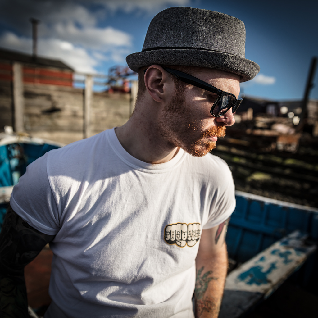 Cameron in shades and hat at fishing harbour