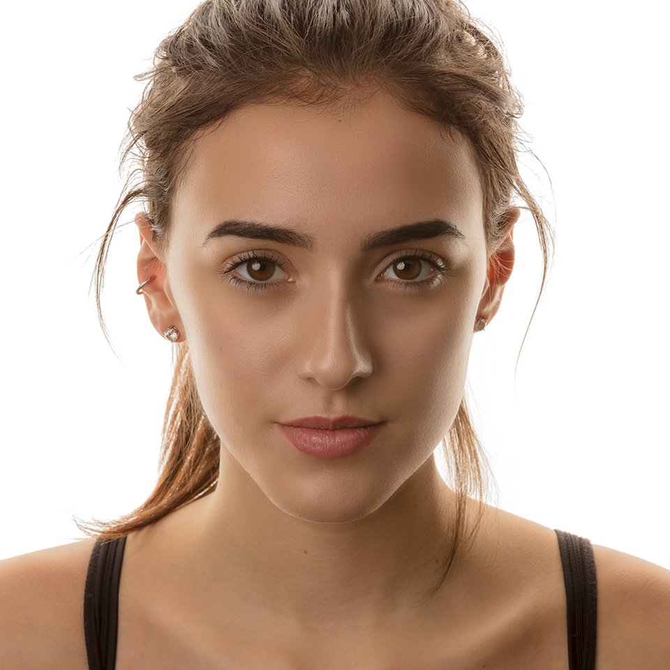 Full face beauty photograph of Amelia-Rose with perfect skin and nicely casual hair against a perfect white background, headshot style.